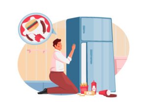 - Nutrition flat composition with male character thinking of food embracing the fridge vector illustrationly. If the door of the refrigerator is left open for a long time, the compressor of the refrigerator will have to work harder, as warm air enters the refrigerator.